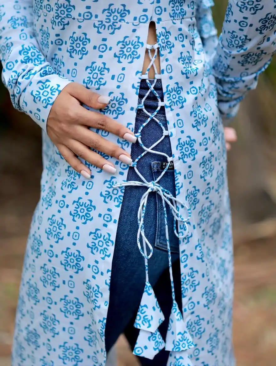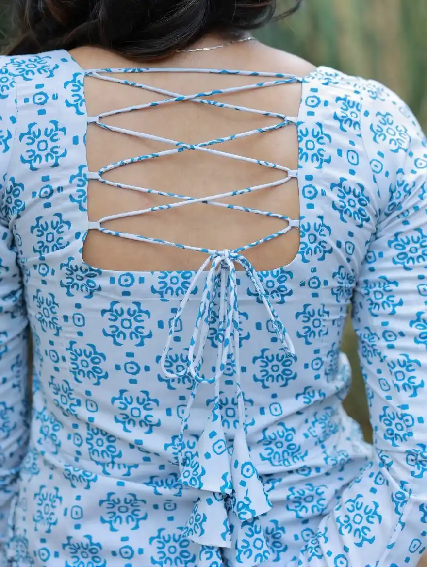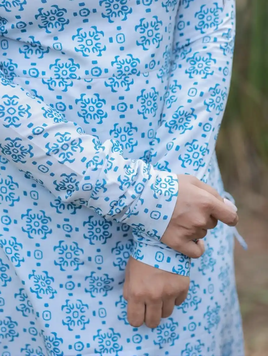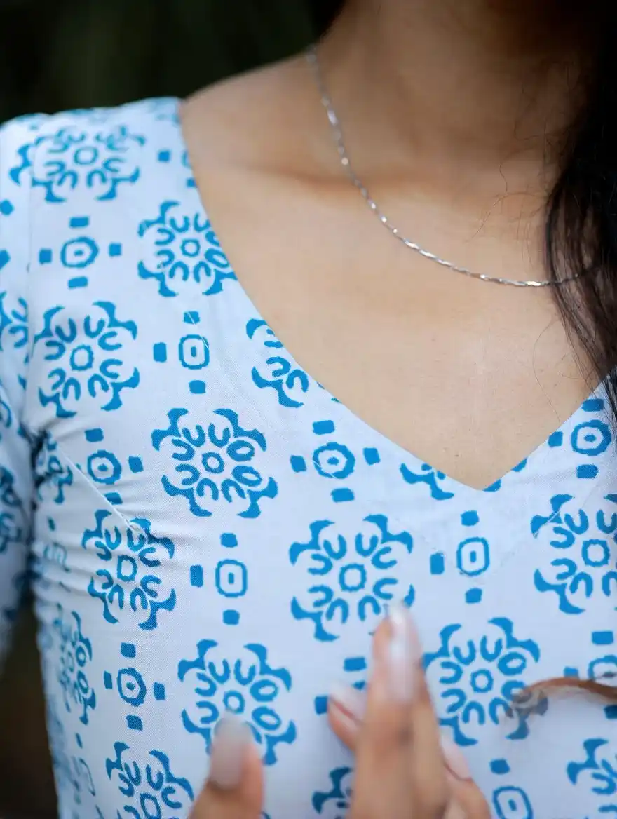 Dusky white with bluebird blue printed swiss cotton