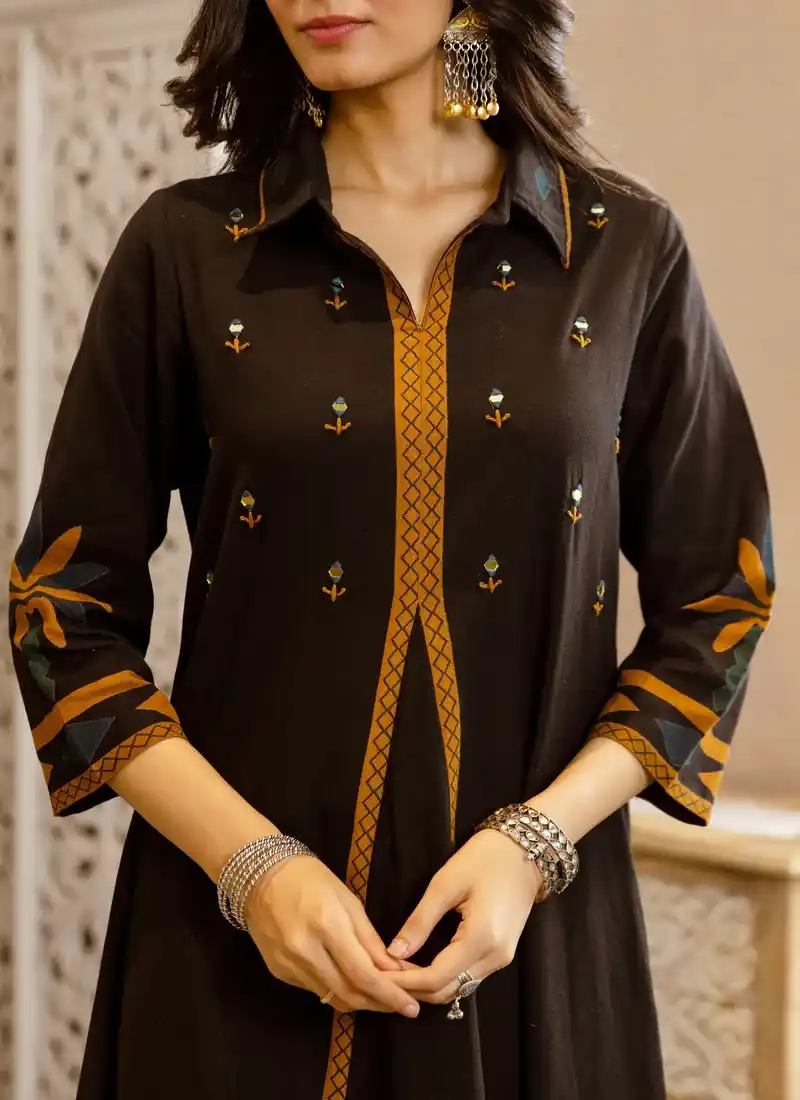 Black Marigold Mirrorwork A Line Cotton Kurta Set