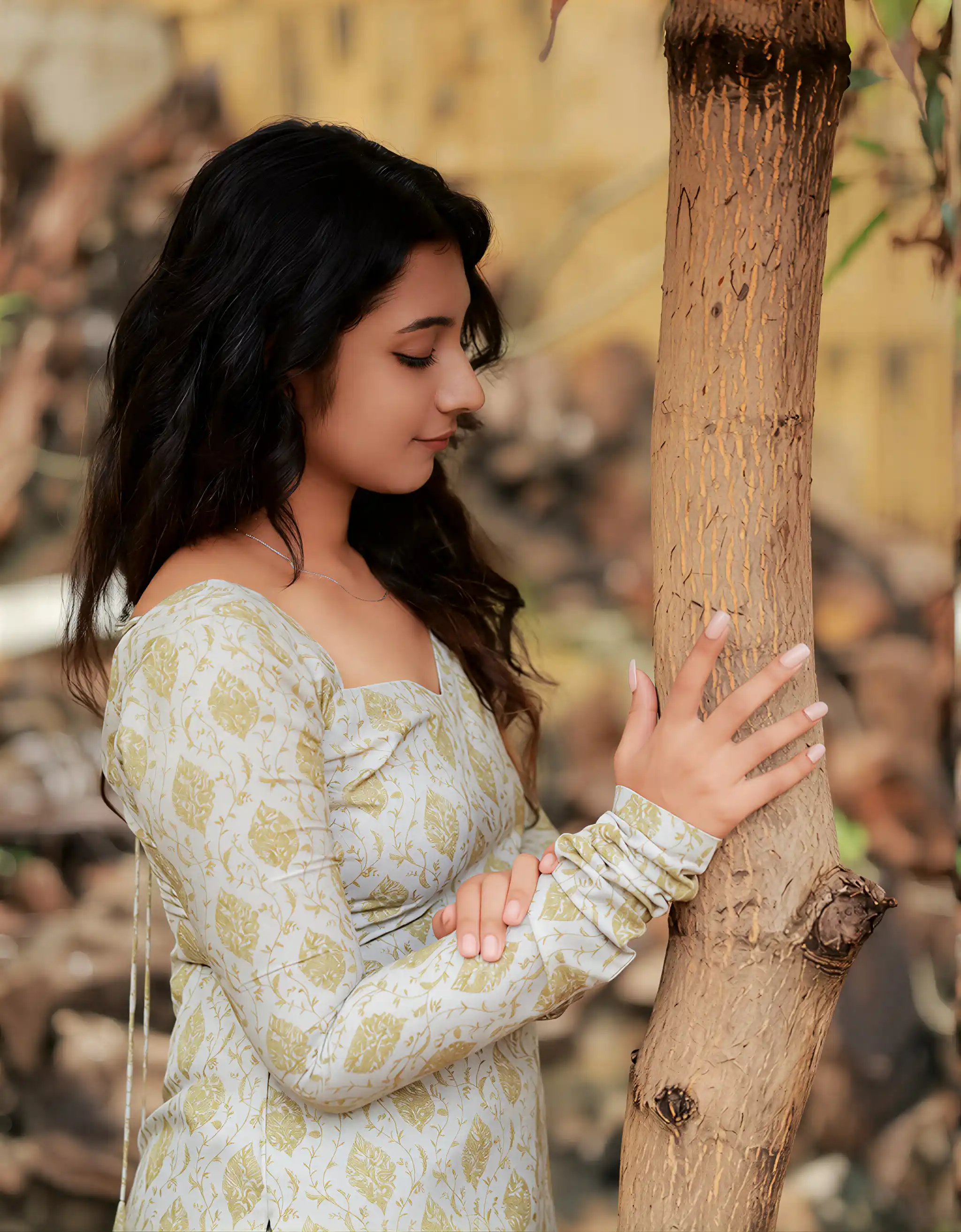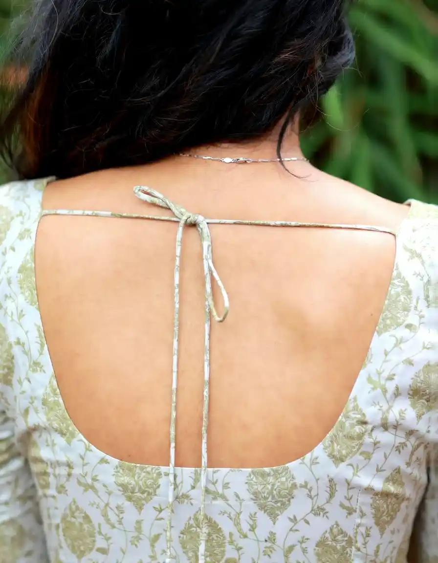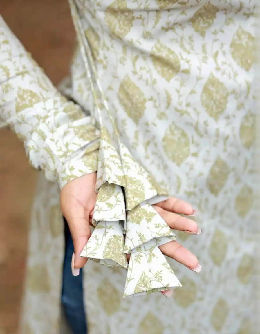 Women’s Ivory & Olive Floral Printed Kurti with Tie-Up Sleeves