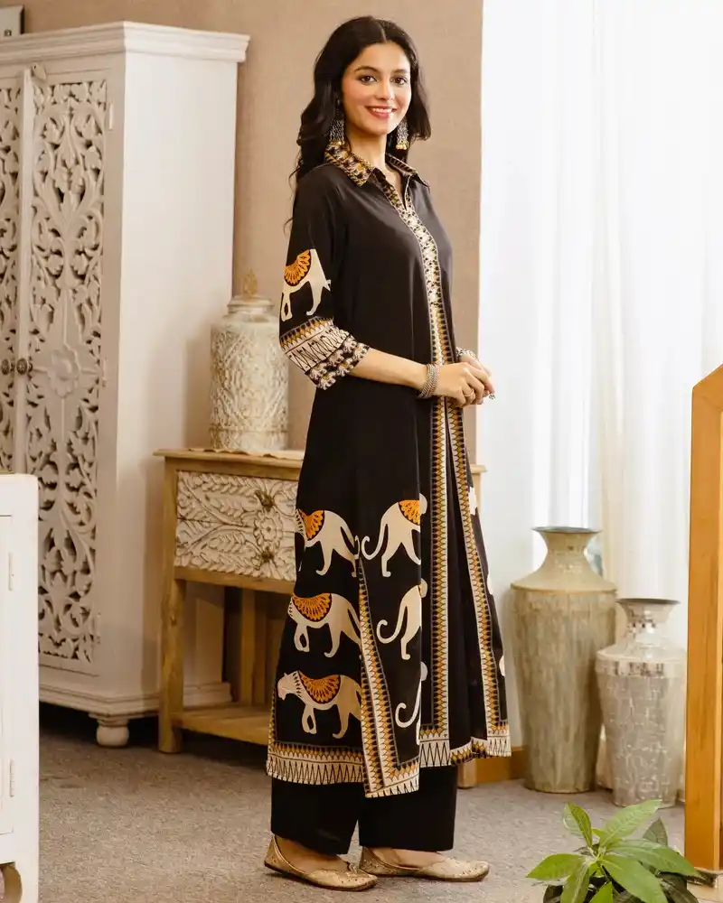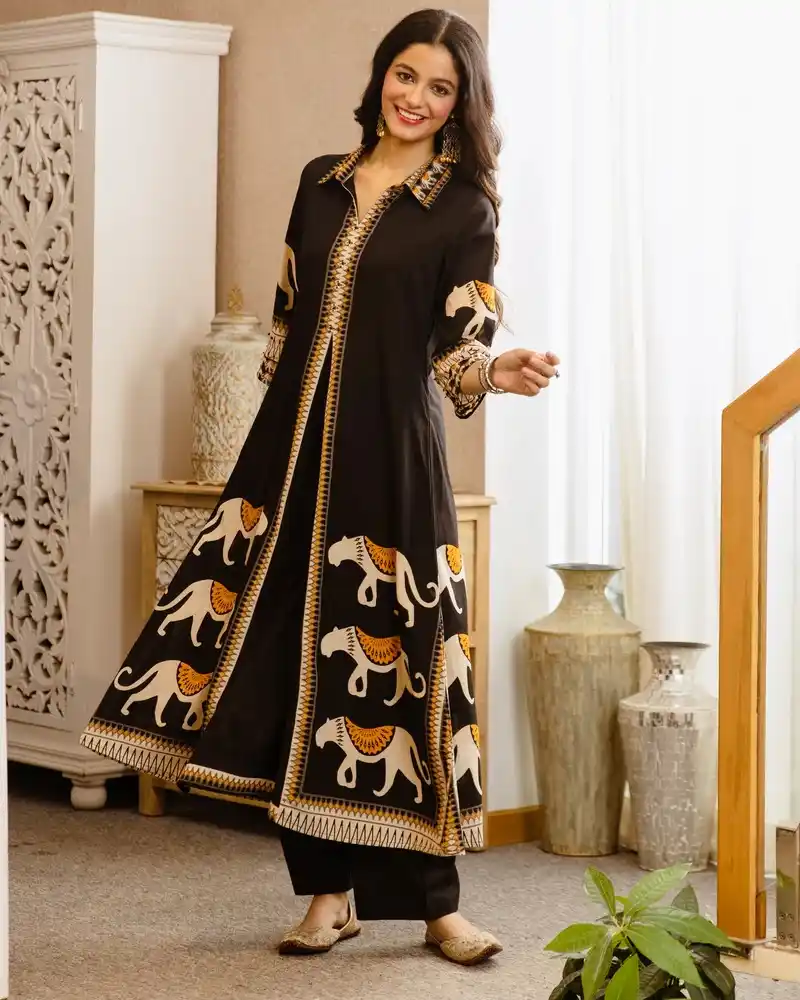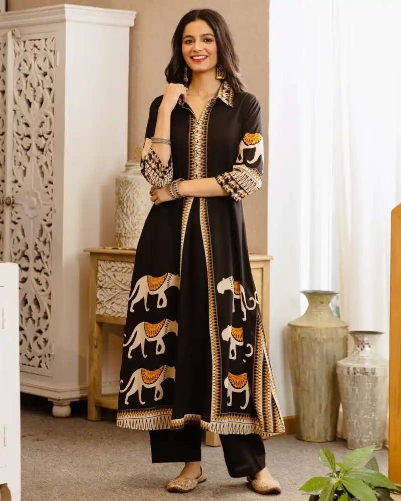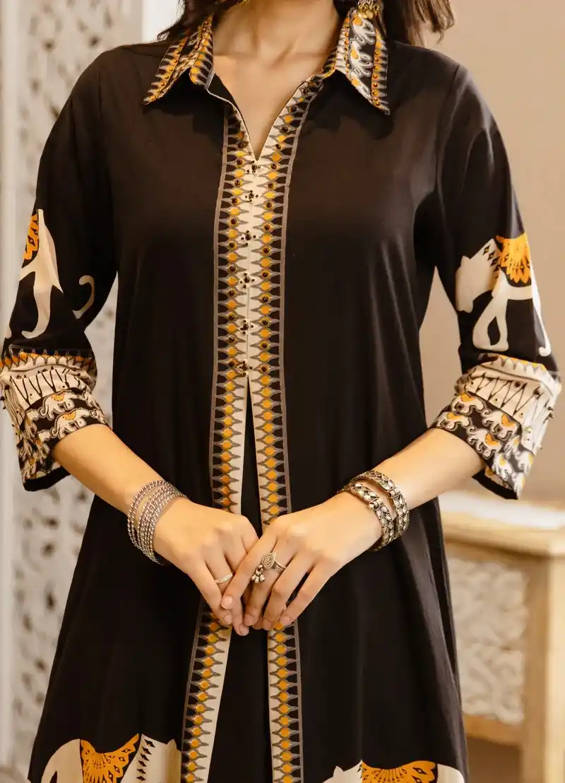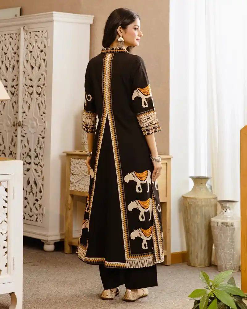Black Tribal Bagh Beadwork A Line Cotton Kurta Set